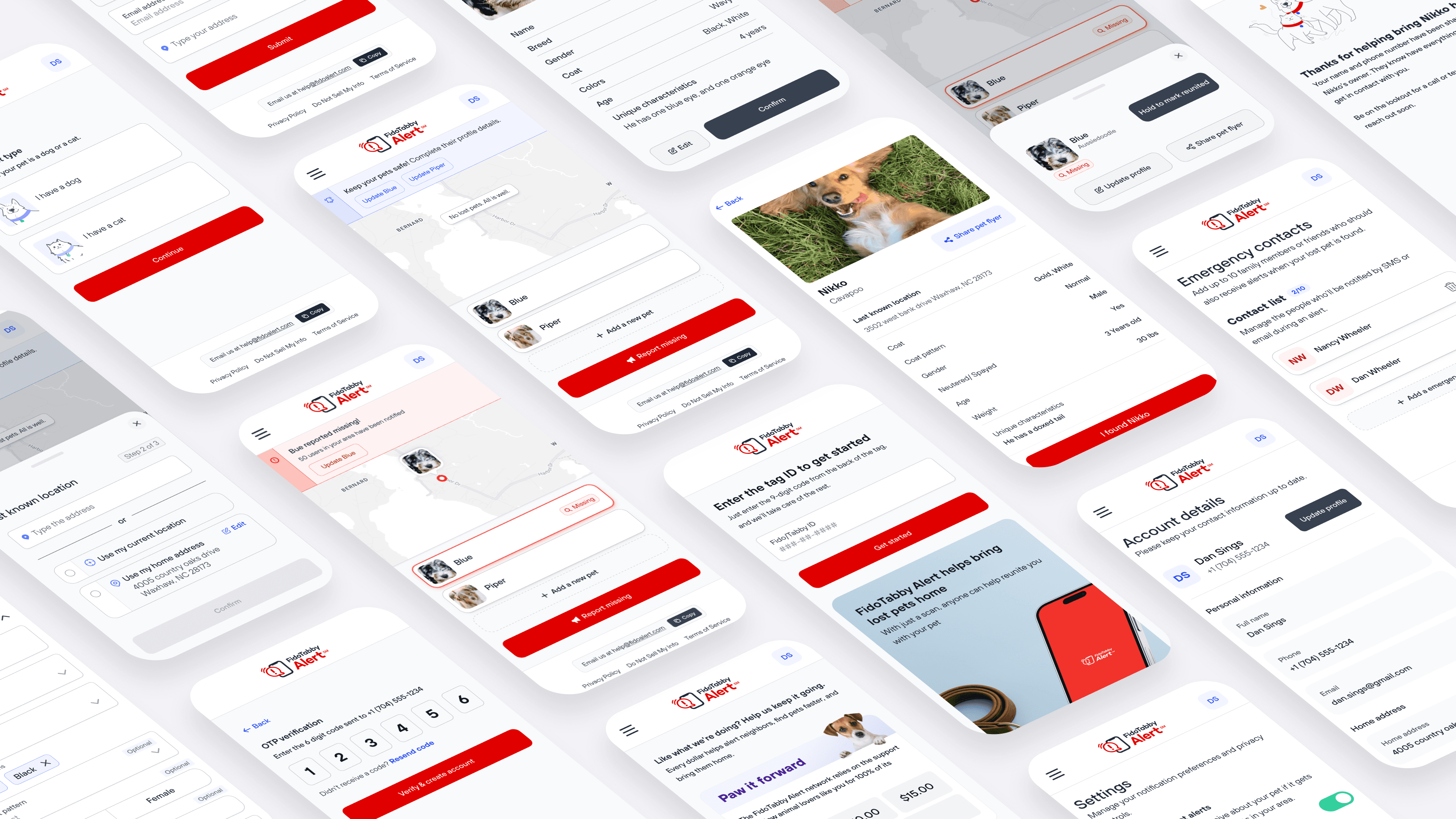 FidoTabby is a nationwide lost pet alert system helping over 1.6 million users reconnect with their pets. This redesign focused on simplifying the alert process, improving pet management, and introducing a “tag-first” retail model that seamlessly connects physical tags with the digital network.